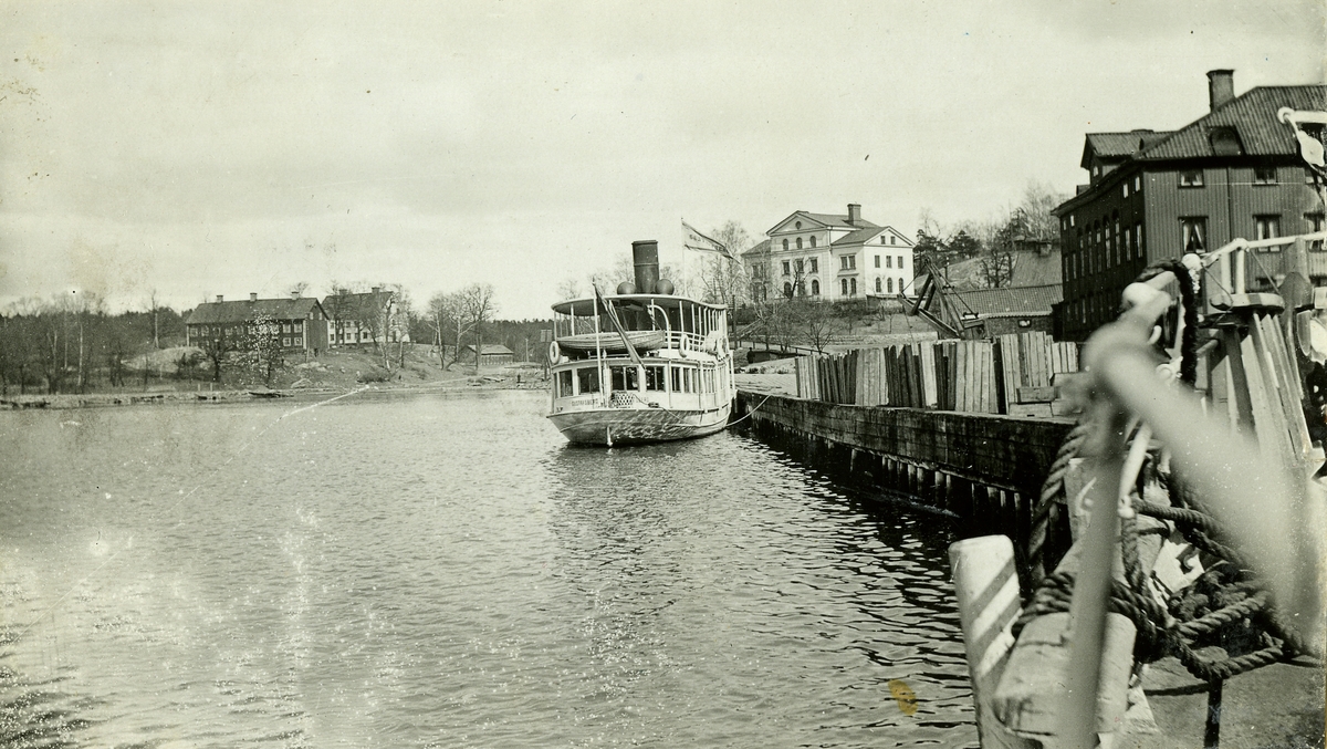 Gustavsbergsbåt vid kajen. Statbyggningen och Ekensberg till vänster, Värdshuset till höger i bakgrunden och Gula byggningen skymtar till höger.