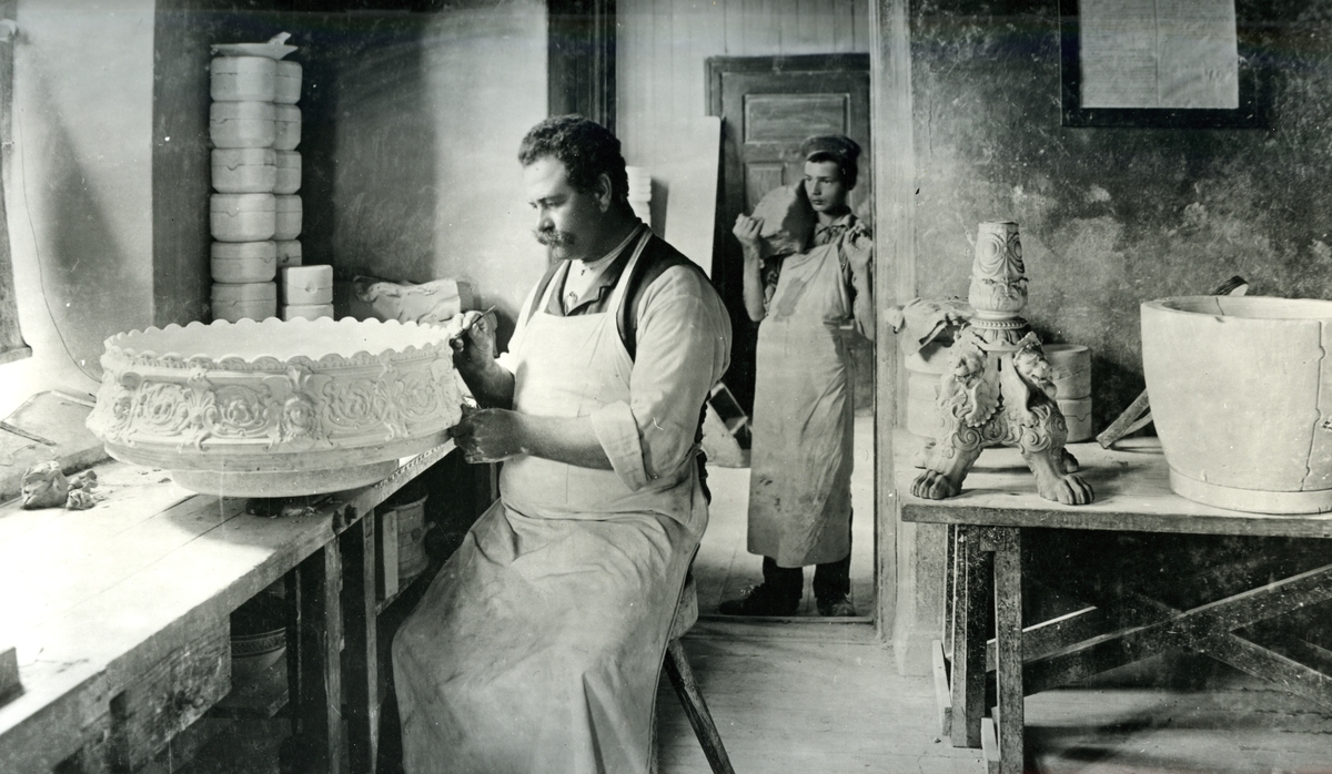 Titel: Fajansarbete i Nya Verkstaden, augusti 1895. Personer: Frans Lundin, okänd