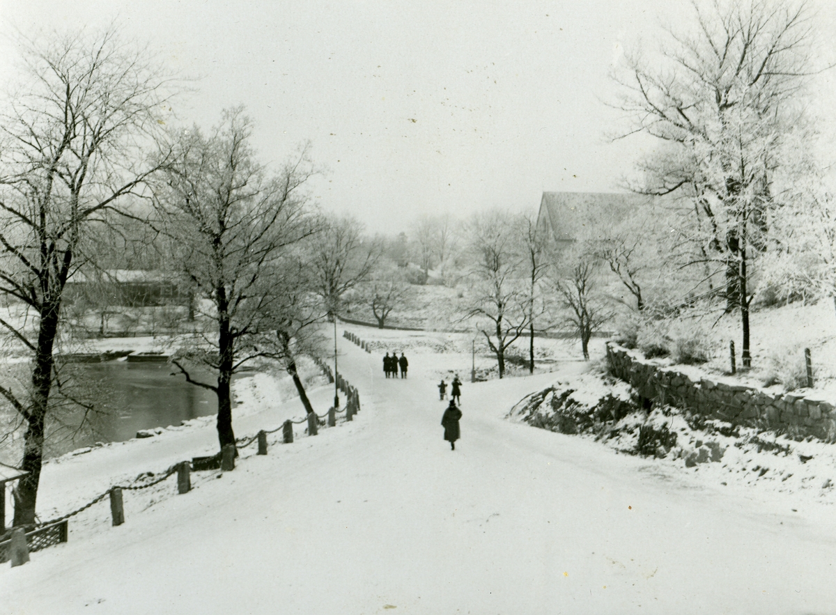 Vy mot Gustavsbergs kyrka som skymtar till höger i bakgrunden.