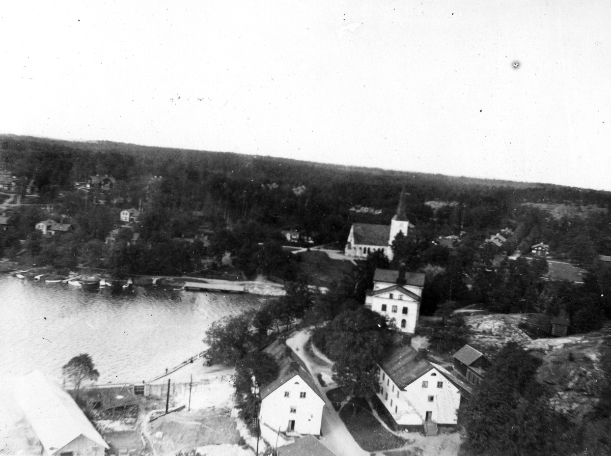 Vy från ovan över Farstaviken, Stenhusen i förgrunden och Värdshuset och Gustavsbergs kyrka i bakgrunden.