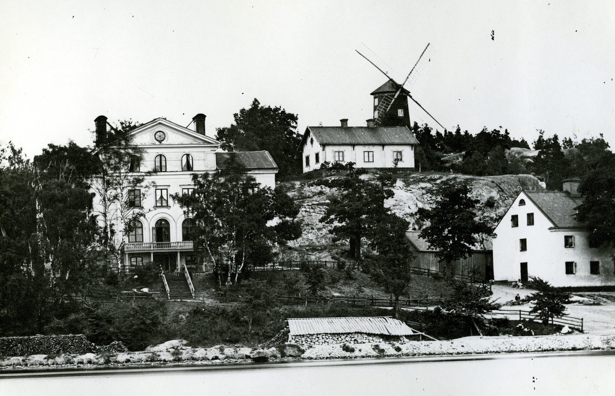 Från vänster Värdshuset, mjölnarbostaden Stjärnan, högst upp på Kvarnberget syns Väderkvarnen. Till höger skymtar Övre Stenhuset.