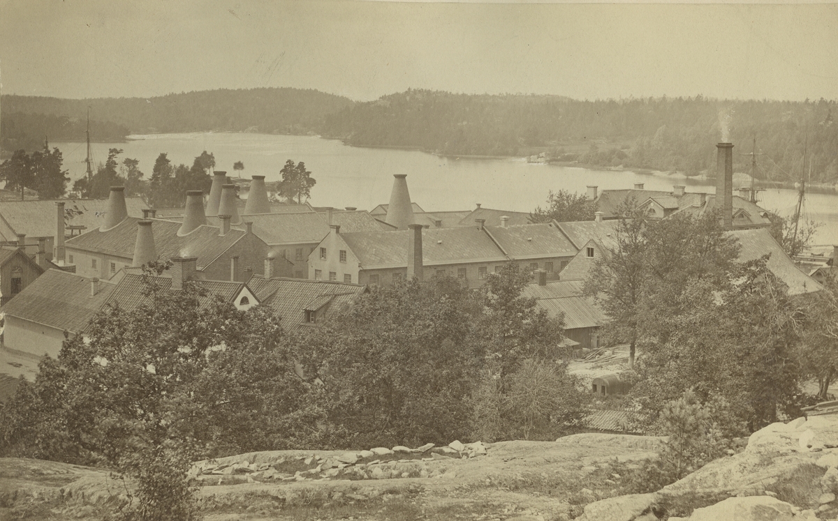 Vy över fabriksområdet och Farstaviken.
