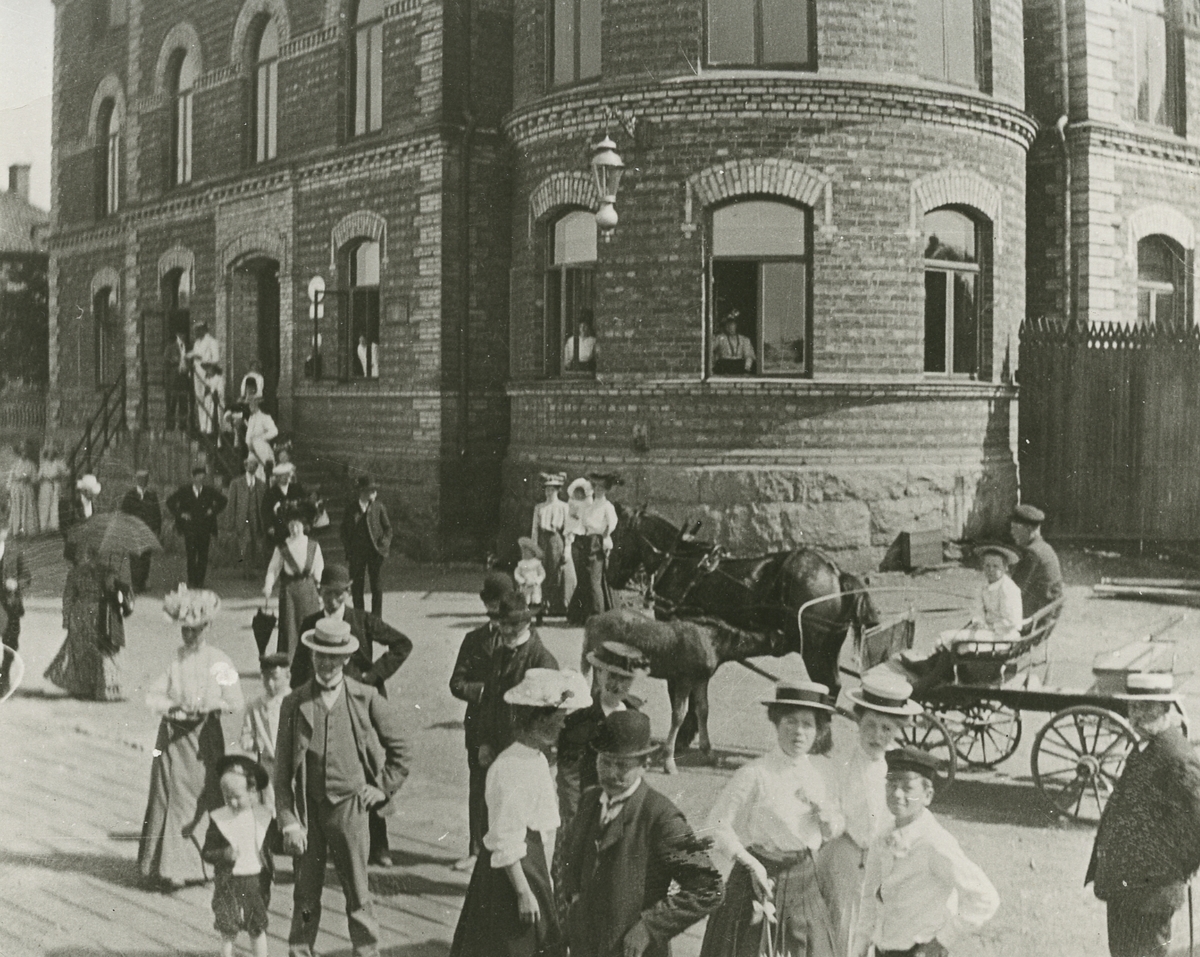 Ångbåtspassagerare på kajen utanför Huvudkontoret.