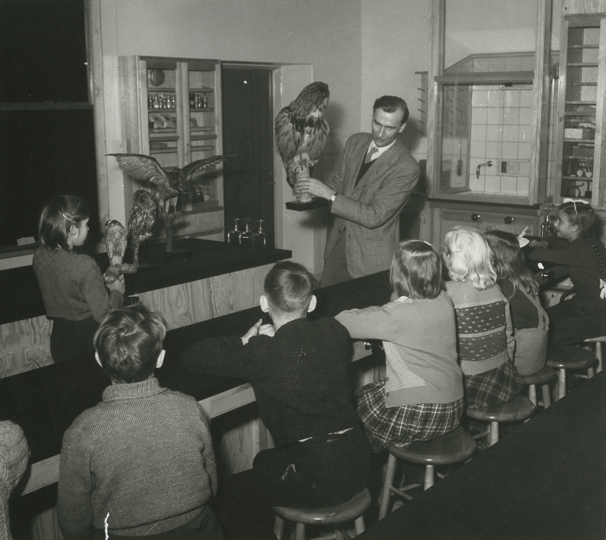 Titel: Interiör. Kvarnbergsskolan. Skolklass. Personer: Övre raden nr 4 fr v: Aldor Olsson. <br>Lärare: Enok Gjörfeldt.