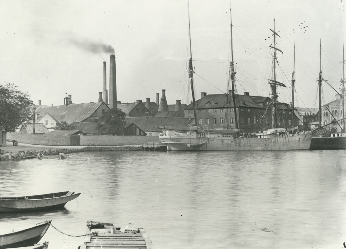 Skonare förtöjda vid kajen i Gustavsbergs hamn. I bakgrunden Brännhuskomplexet till vänster och Gula byggningen till höger.