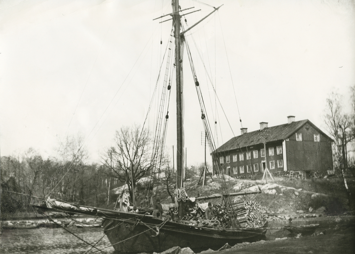 Vedjakt i Gustavsbergs hamn. I bakgrunden Statbyggningen.