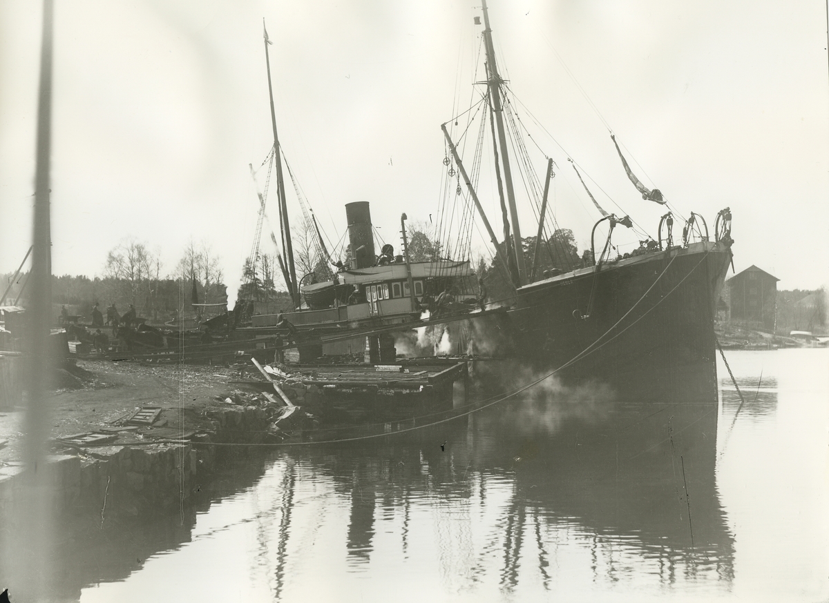 Lastfartyg i Gustavsbergs hamn, i bakgrunden till höger skymtar Elkvarnen, byggd 1882, verksam som elkvarn fr o m 1905.