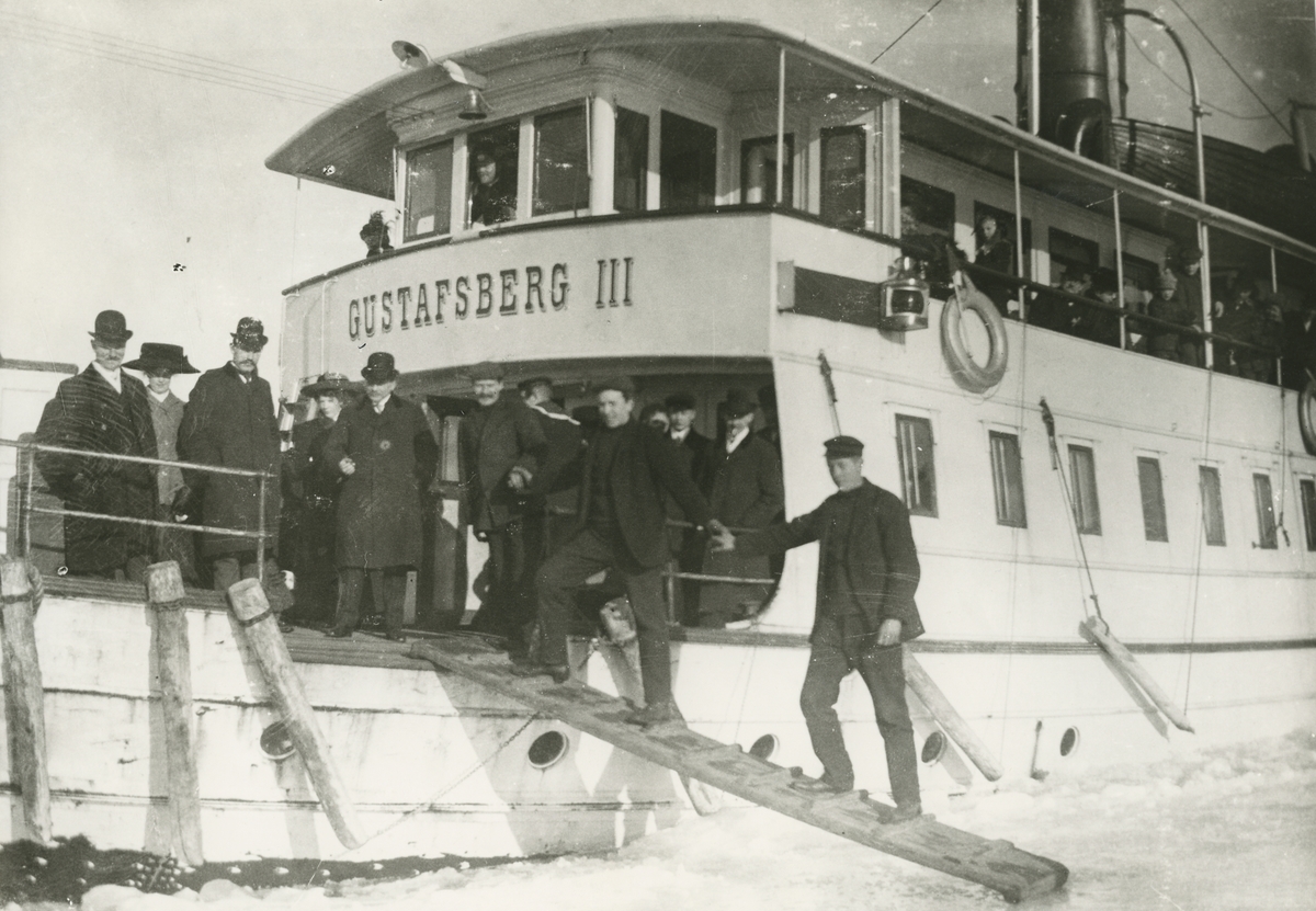 Besättning och passagerare på Gustavsberg III. Troligen kapten Westerberg i styrhytten.