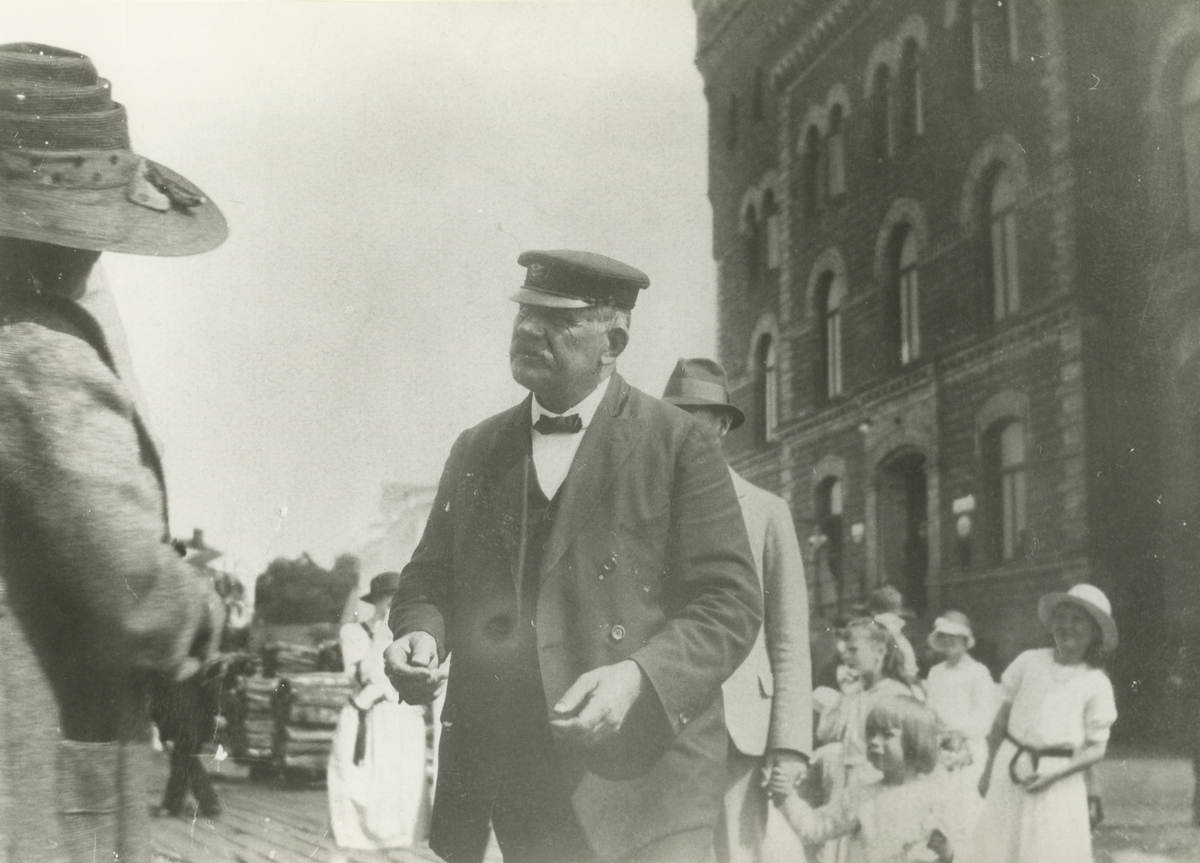 Styrman Emanuel Hedberg, alltid verksam på samma båt som sin kusin kapten Westerberg (G Alexandersson). På kajen utanför väntrummet i Huvudkontoret.