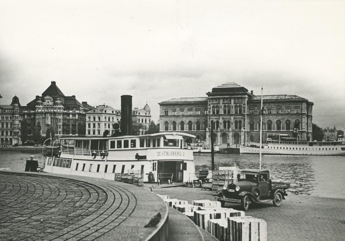 Fabriksrederiets ångbåt Gustavsberg V förtöjd vid Skeppsbron i Stockholm. I bakgrunden Nationalmuseum. <br>