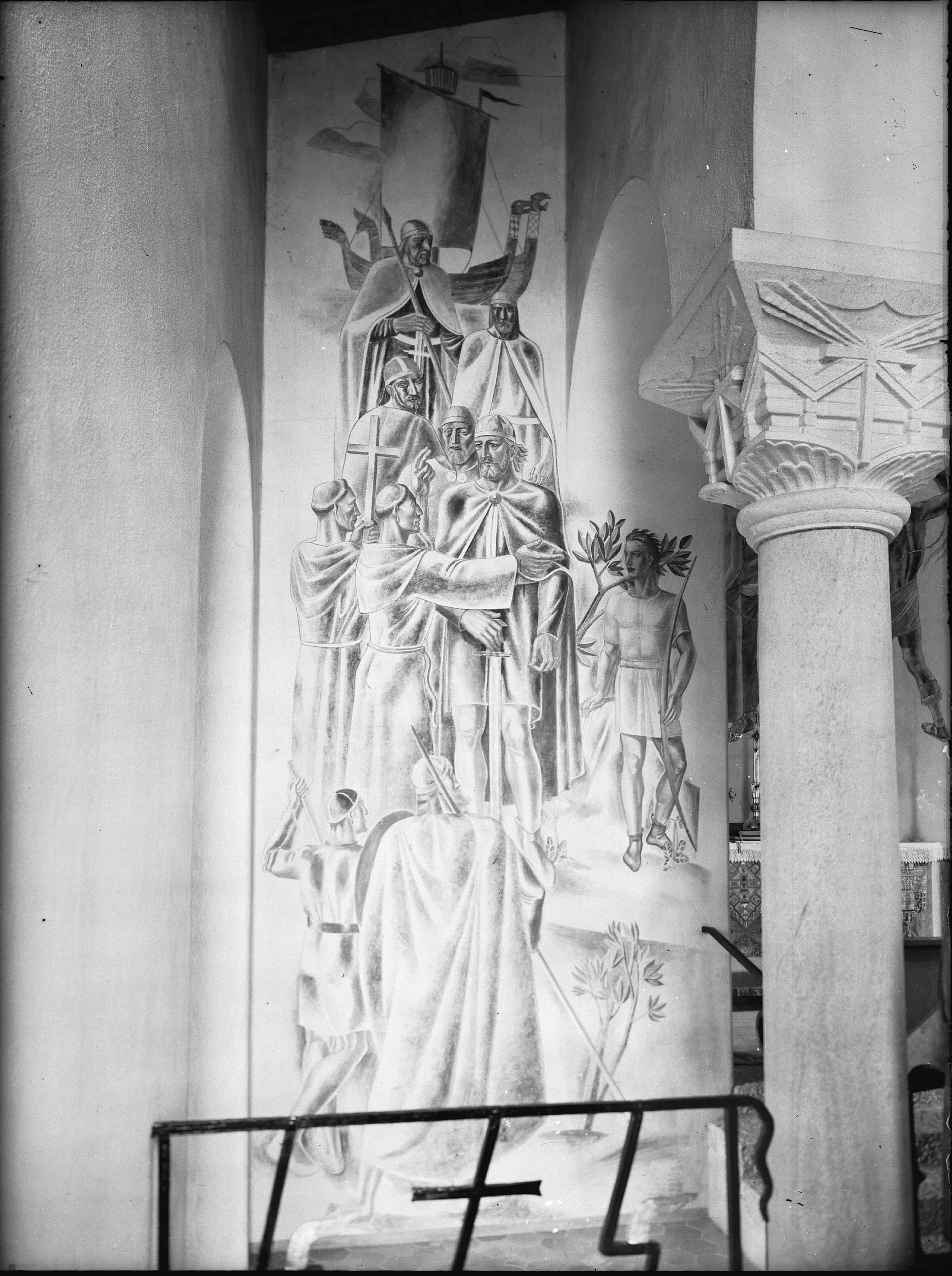 Långhusets nordöstra väggparti med kalkmålningar av Gunnar Torhamn. Foto omkring 1930.