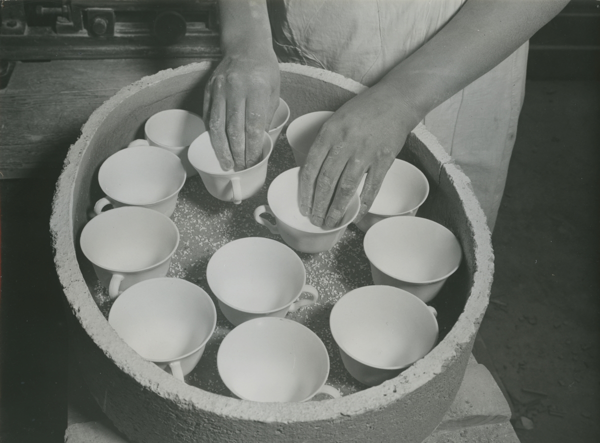 Interiör porslinsfabriken. Packning av kapsel för bränning av porslin.