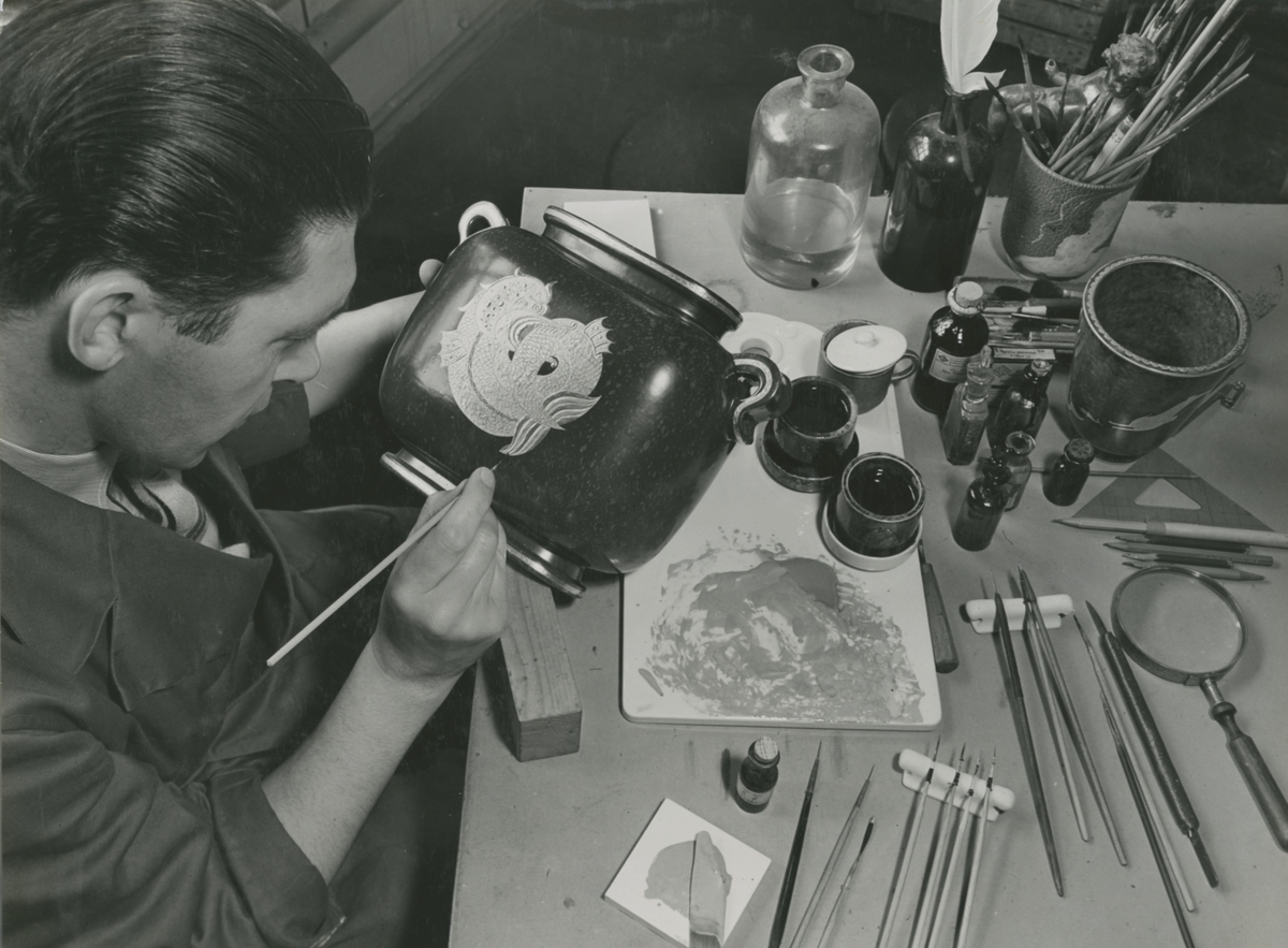 Interiör från Studion, Gustavsbergs Fabriker. Calle Blomqvist målar Argenta.