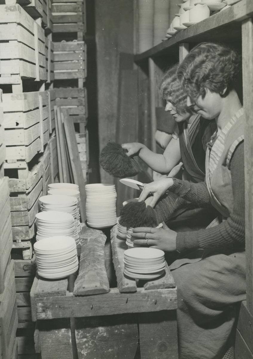 Damning med borste av rågodsbrända tallrikar som ska glaseras (Hald, 1991:126).