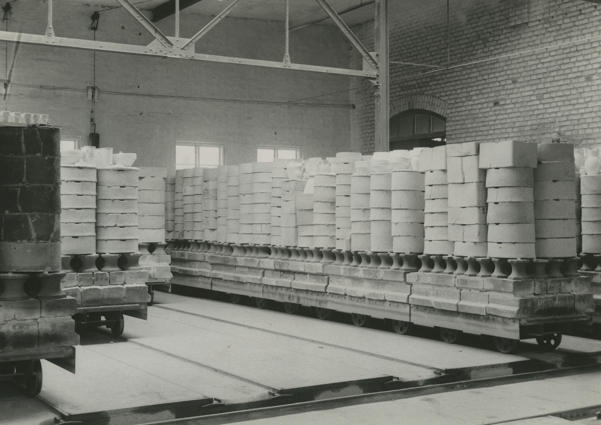 Bild av staplade kokor, kapslar som porslinet packades i för bränning.