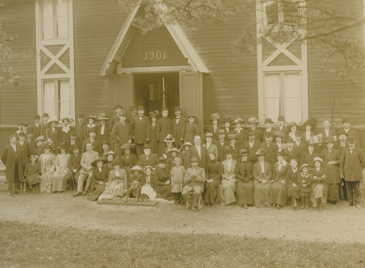 Gruppfoto. Missionsförsamlingen framför sitt här ganska nya hus, byggt 1901.