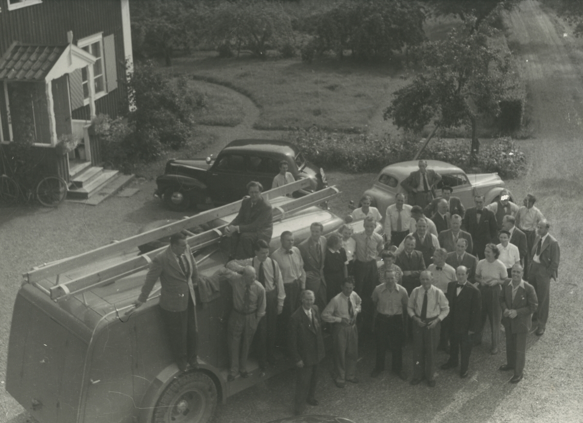 Personer: Längst ned t.h. Harry Pettersson, Alice Pettersson, Vilhelm Gezelius. På taket: Fritz Berg och Ando Björk. Övriga okända men är politiker i Gustavsberg.