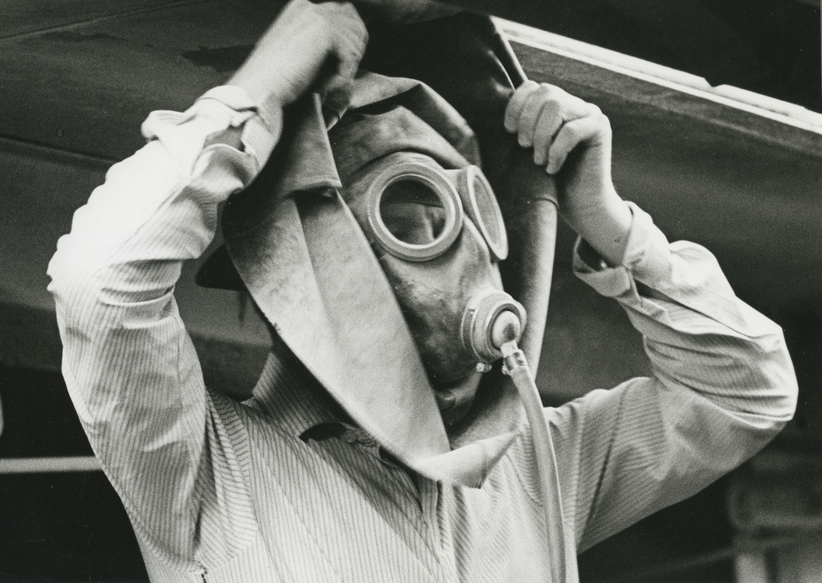 Titel: Interiör, Badkarsfabriken. Arbetare iförd skyddsmask med friskluftintag som användes vid manuell emaljsprutning. Personer: okänd