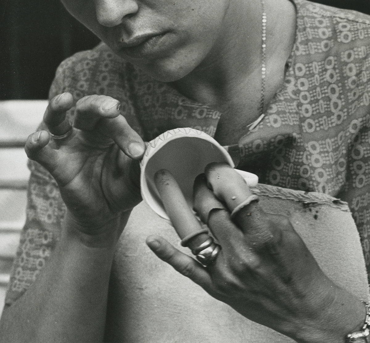 Detaljbild. Fastsättning av cromotryck på kaffekopp. Hushållsporslinsfabriken.