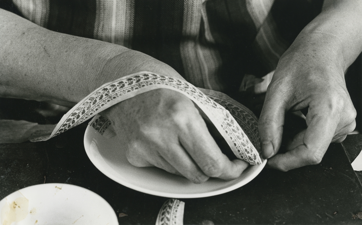 Detaljbild, Dekoravdelningen. Fastsättning av dekortryck på kaffefat.