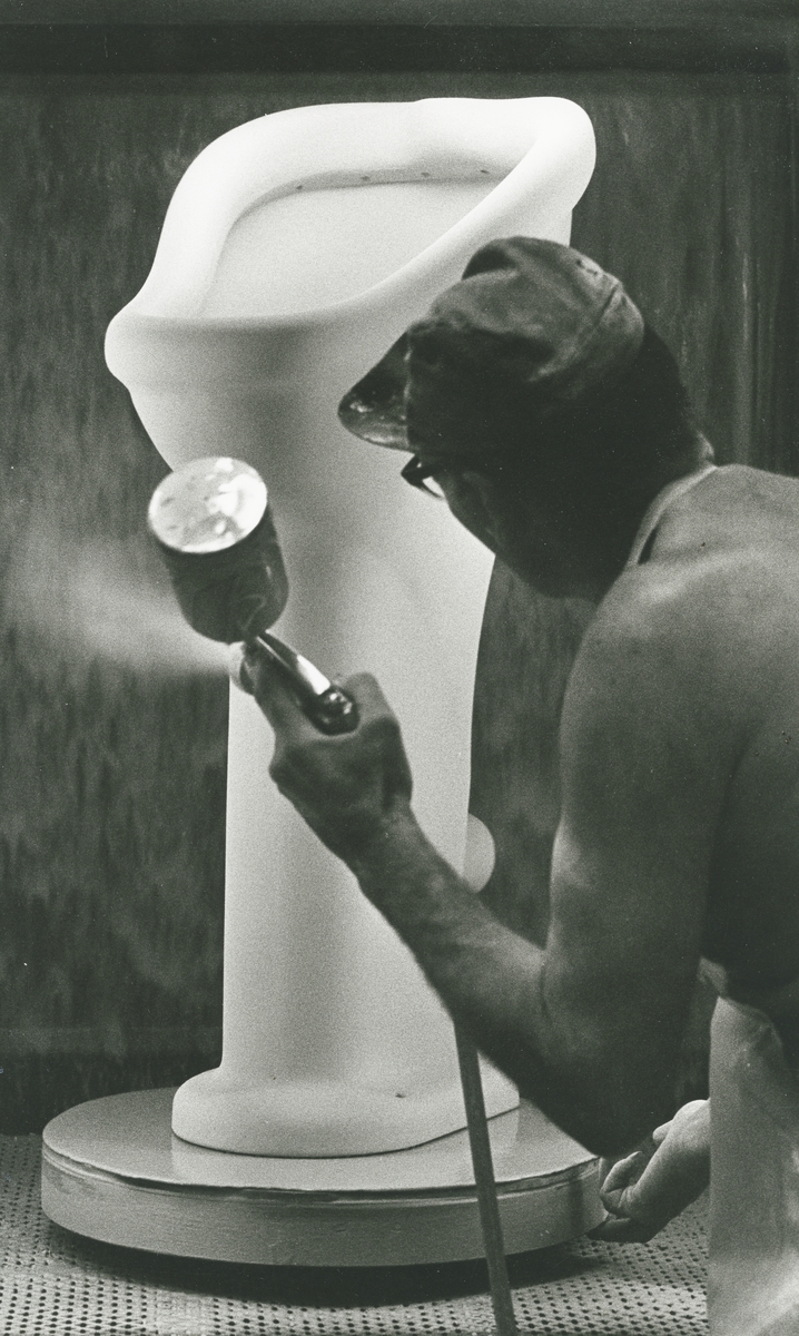Interiörbild. Sanitetsporslinsfabriken. Manuell glasyrsprutning av pelarurinoar.