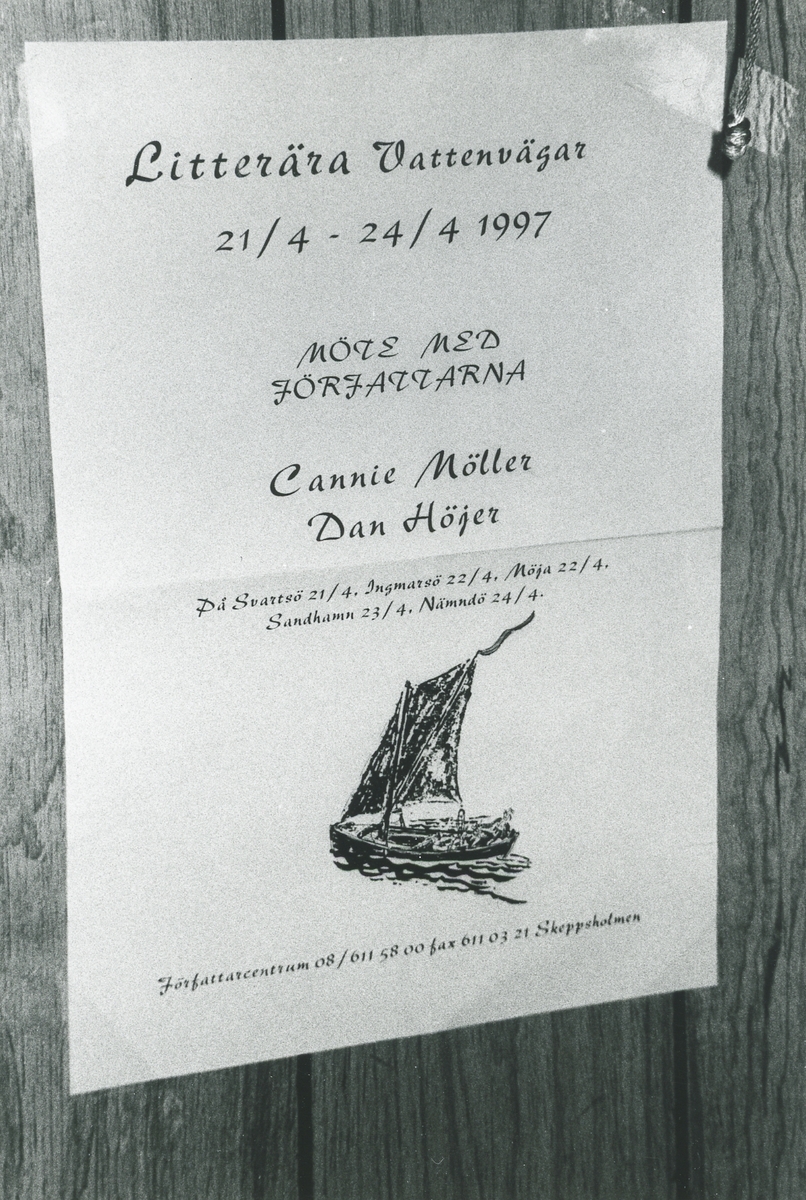 Affisch med information om ett turnerande författarprogram i Värmdö skärgård på Bokbåten.
