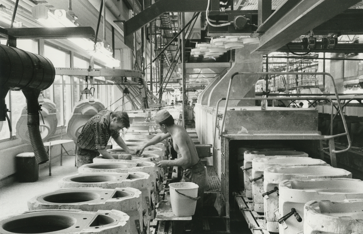 Interiör. Sanitetsporslinsfabriken. Pågående gjutning av wc-stolar.<br>