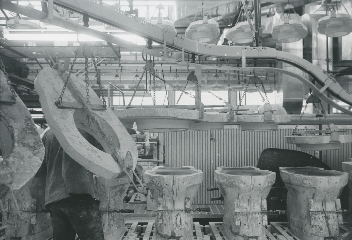 Interiör, Sanitetsfabriken. Wc-stolar i gjutformar.<br>