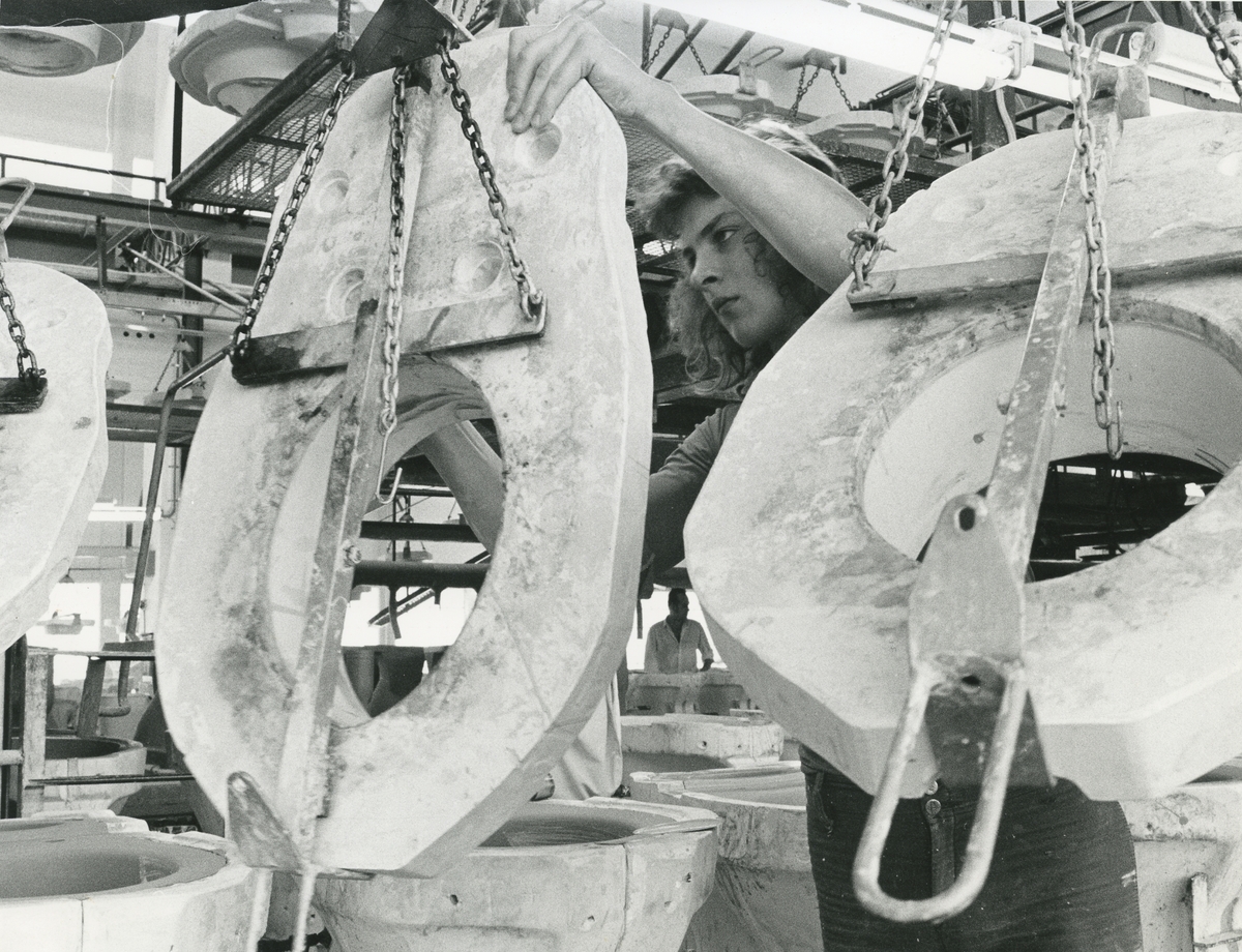 Sanitetsporslinsfabriken.Gipsgjutning av wc-stolar.