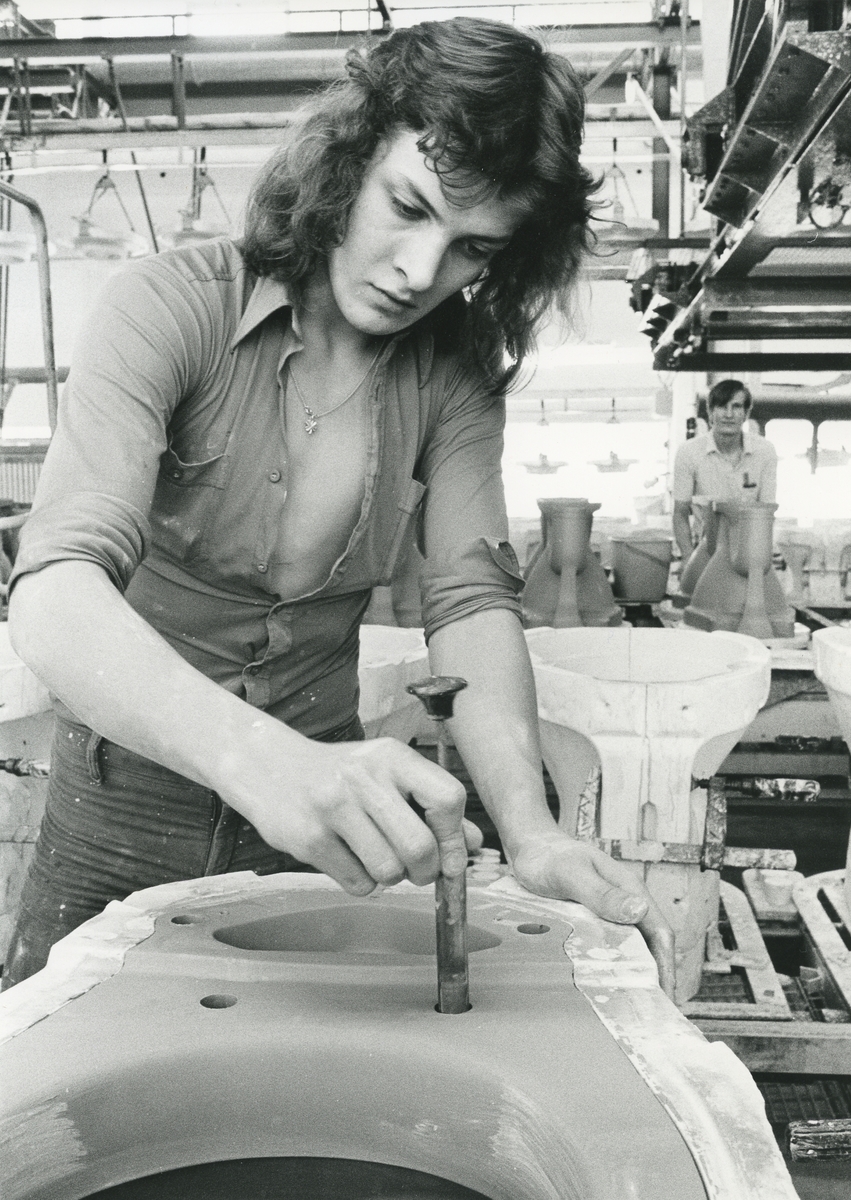 Detaljbild, Sanitetsporslinsfabriken. Utvidgning av hål för skruvanordning i gjuten wc-stol.