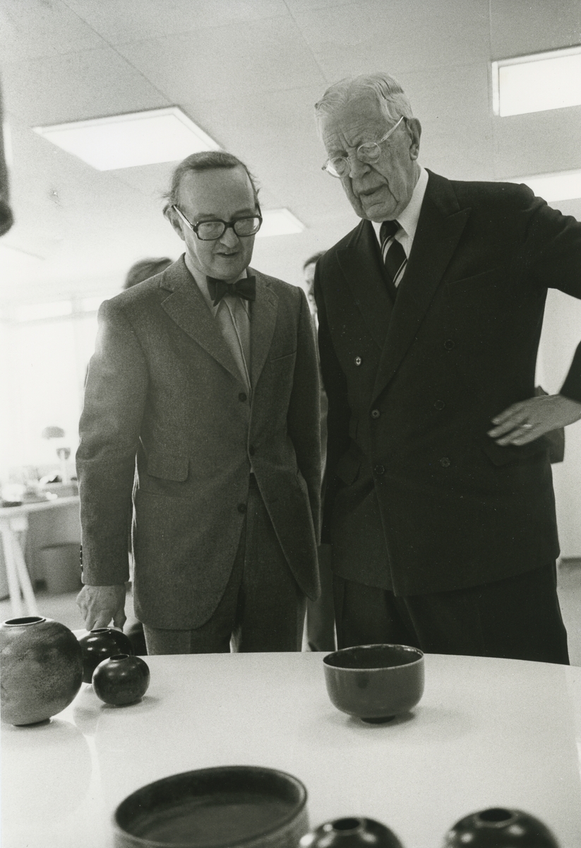 Kungligt besök på Gustavsbergs porslinsfabrik. Stig Lindberg förevisar stengodsskålar, sannolikt i Gustavsbergs Studio.