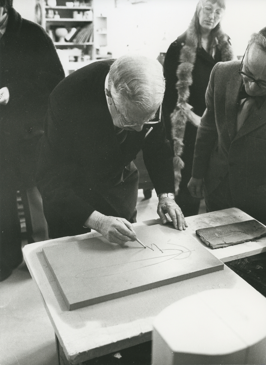 Kungligt besök på Gustavsbergs porslinsfabrik, sannolikt i en av konstnärsateljeerna. Kungen skriver sin namnteckning i lera.