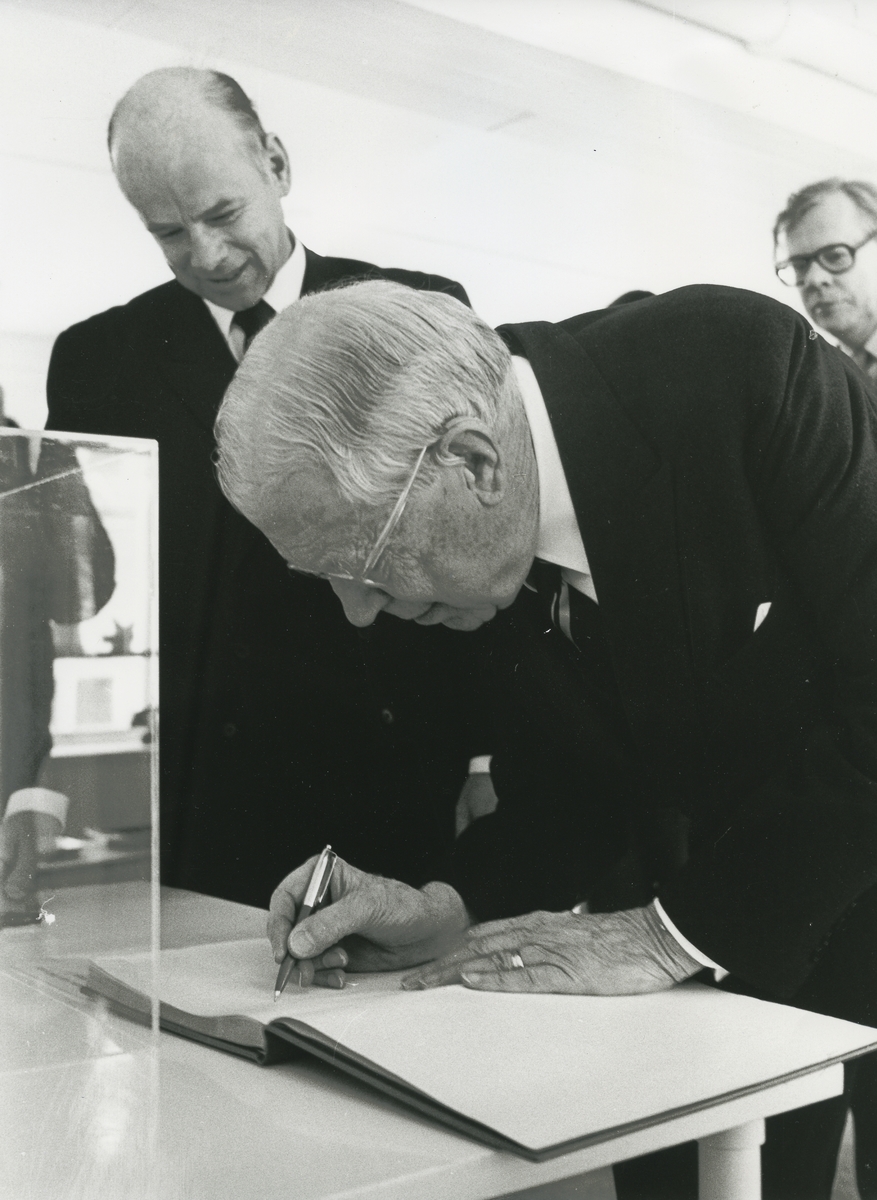 Kungligt besök på Gustavsbergs porslinsfabrik, sannolikt i Gustavsbergs Studio. Kungen skriver i gästboken.
