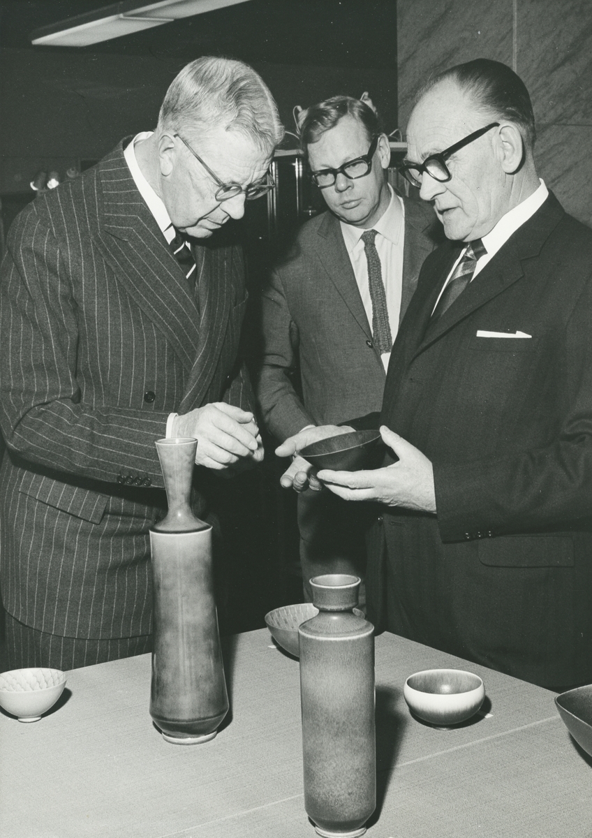 Interiör. Berndt Friberg förhandsvisar unika stengodspjäser för kung Gustav VI Adolf inför en utställning på NK 1964.