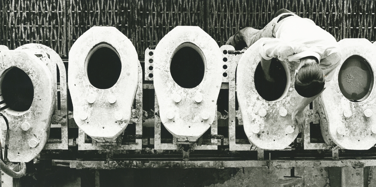 Interiör, Sanitetsporslinsfabriken. Gjutning i gipsformar av wc-stolar.