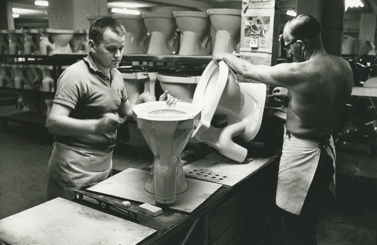 Interiör, Sanitetsporslinsfabriken. Avsyning av gjutna wc-stolar.