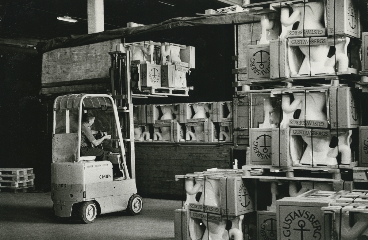 Interiörbild, Sanitetsporslinsfabriken. Lastning av packade wc-stolar.