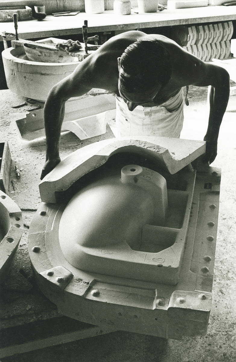 Interiör, Sanitetsporslinsfabriken. Gjutet tvättfat. Isärtagning av gipsform.