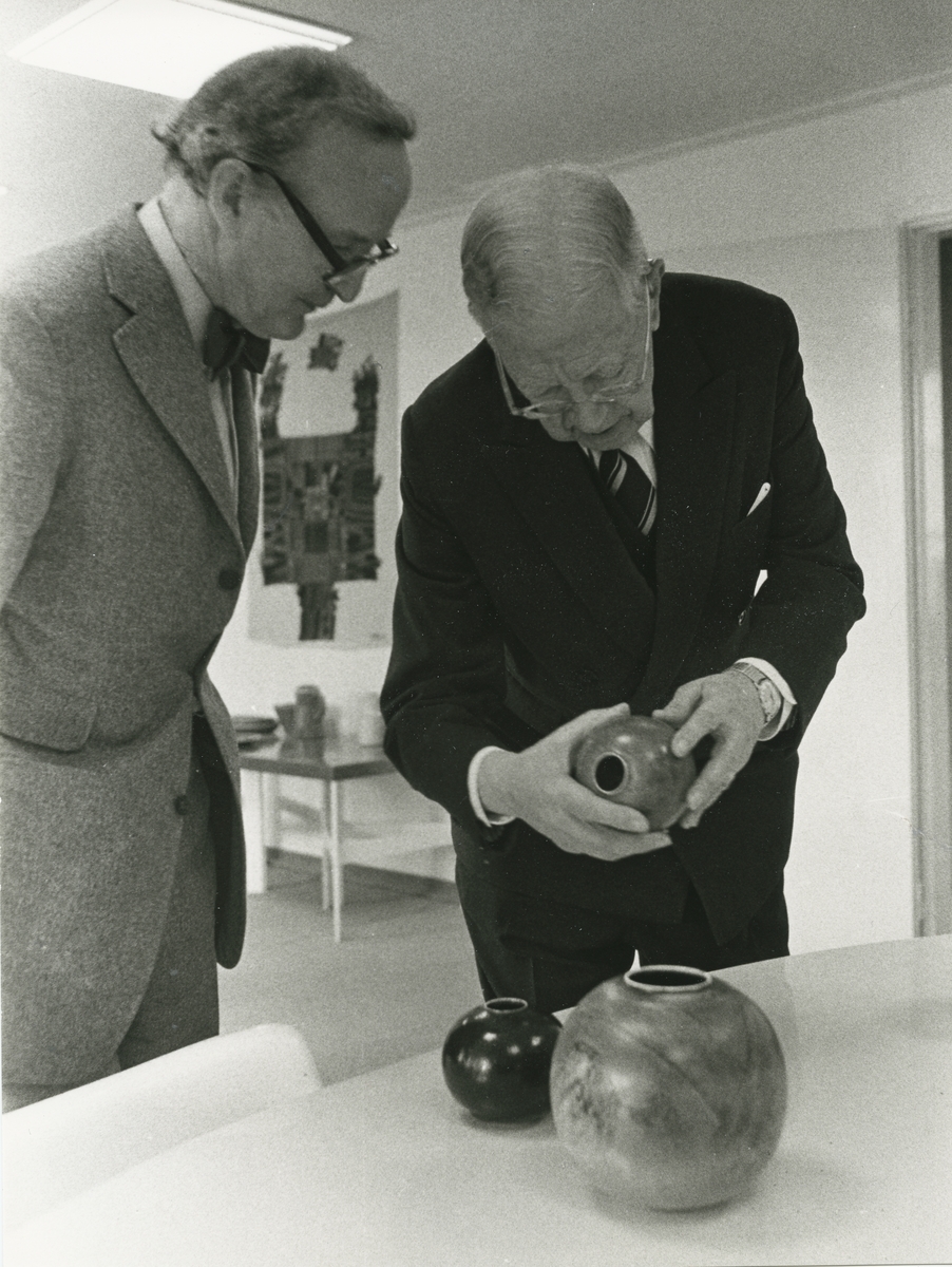 Titel: Interiör. Kungligt besök på Gustavsbergs Fabriker. Stig Lindberg och Kung Gustav VI Adolf. Förevisning av unikt stengods, sannolikt på Keramiskt Centrum. Personer: Stig Lindberg och Kung Gustav VI Adolf