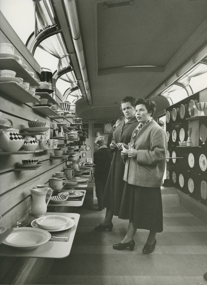 Interiör. Gustavsbergsbussen med besökare som tar del av utställningen.