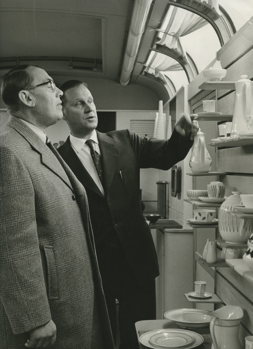 Titel: Interiör. Gustavsbergsbussen med visningsansvarig och besökare som tar del av utställningen. Personer: Erik Karlsson demonstrerar