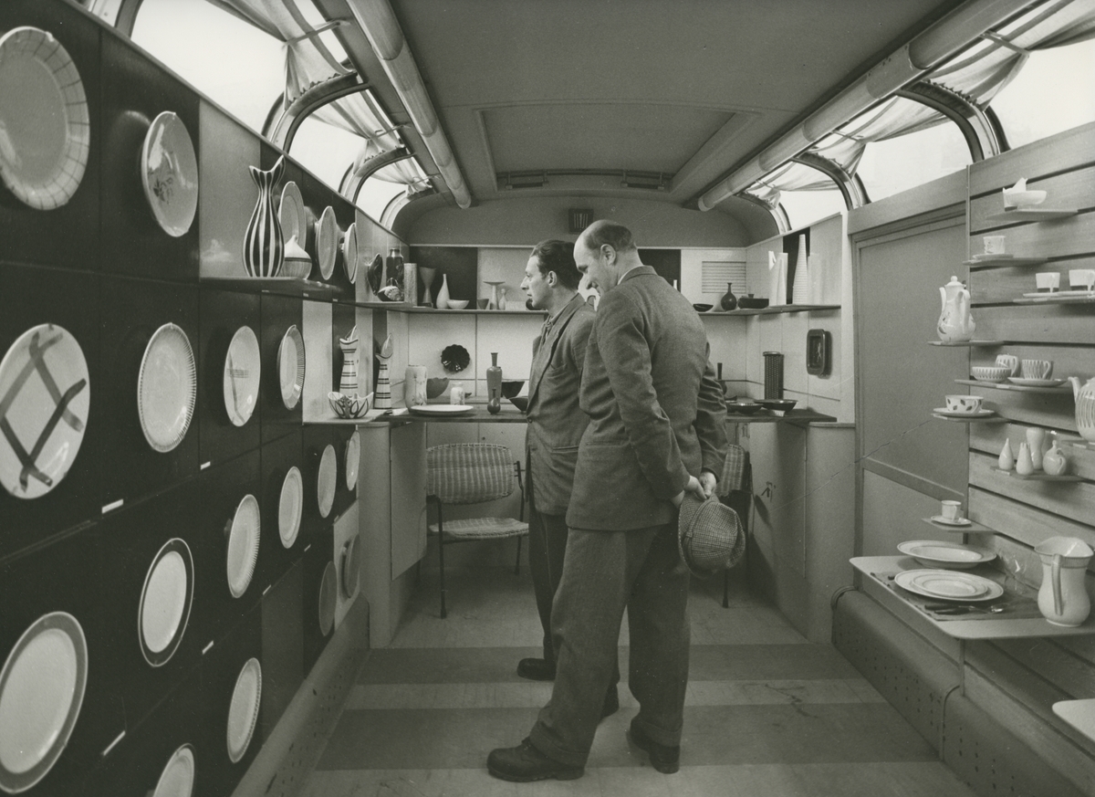 Interiör. Gustavsbergsbussen med besökare som tar del av utställningen.
