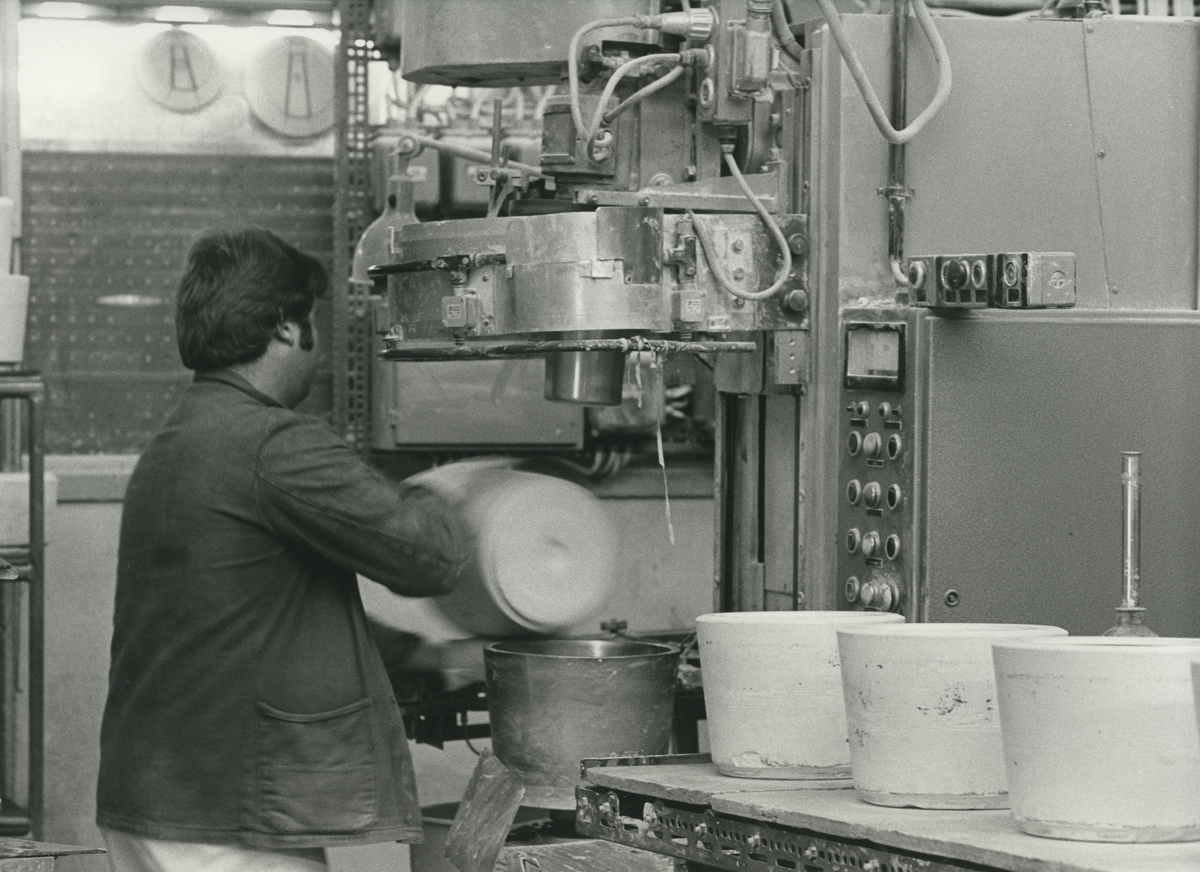 Interiör, Hushållsporslinsfabriken. Rollerformning av krukor.