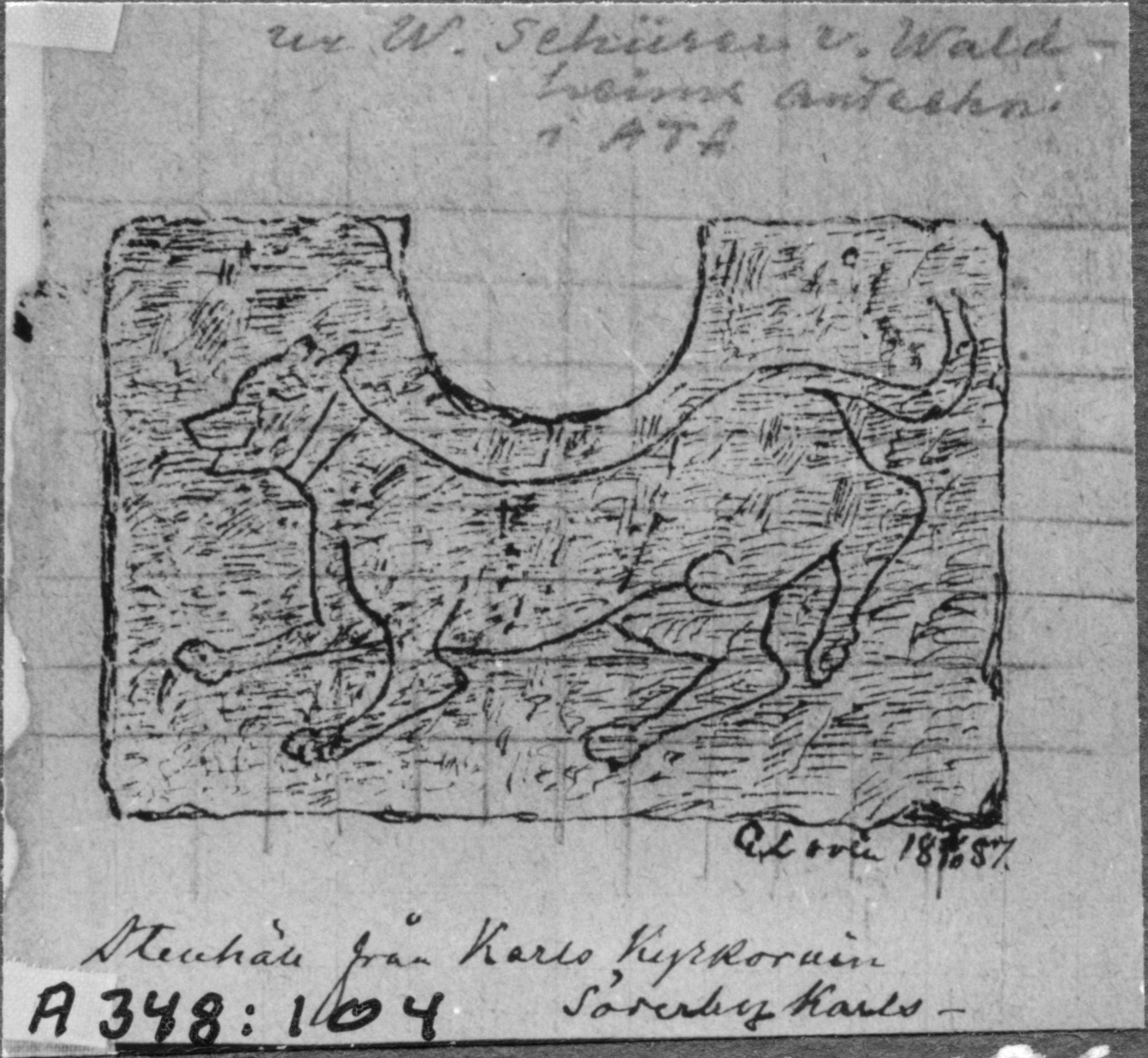 Stenblock, sandsten, med ristad bild föreställande djur, ursprungligen ingående i omfattning till hagioskop i korets södra mur. Foto efter teckning.