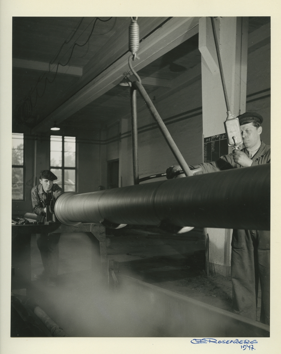 Interiörbld.Tillverkning av centrifugalrör. Centrifugalrörsfabriken i Oxelösund, 1947.