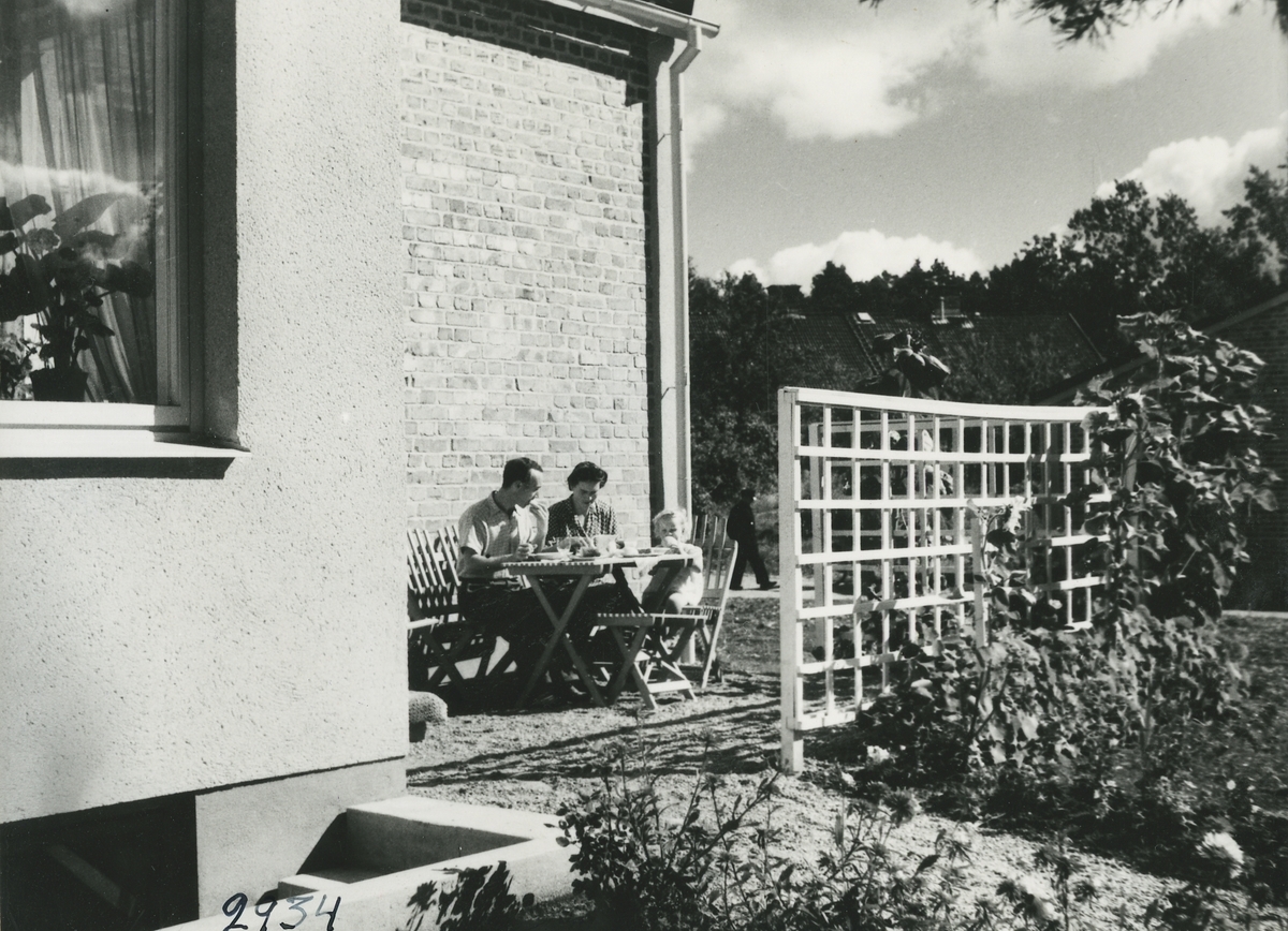Exteriörbild. Radhusområdet, Grindstugärde. Familj intar måltid på uteplats.