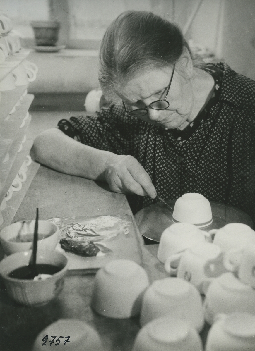 Interiörbild. Hushållsporslinsfabriken, Dekoravdelningen. Penselmålning av dekor på kaffekoppar.