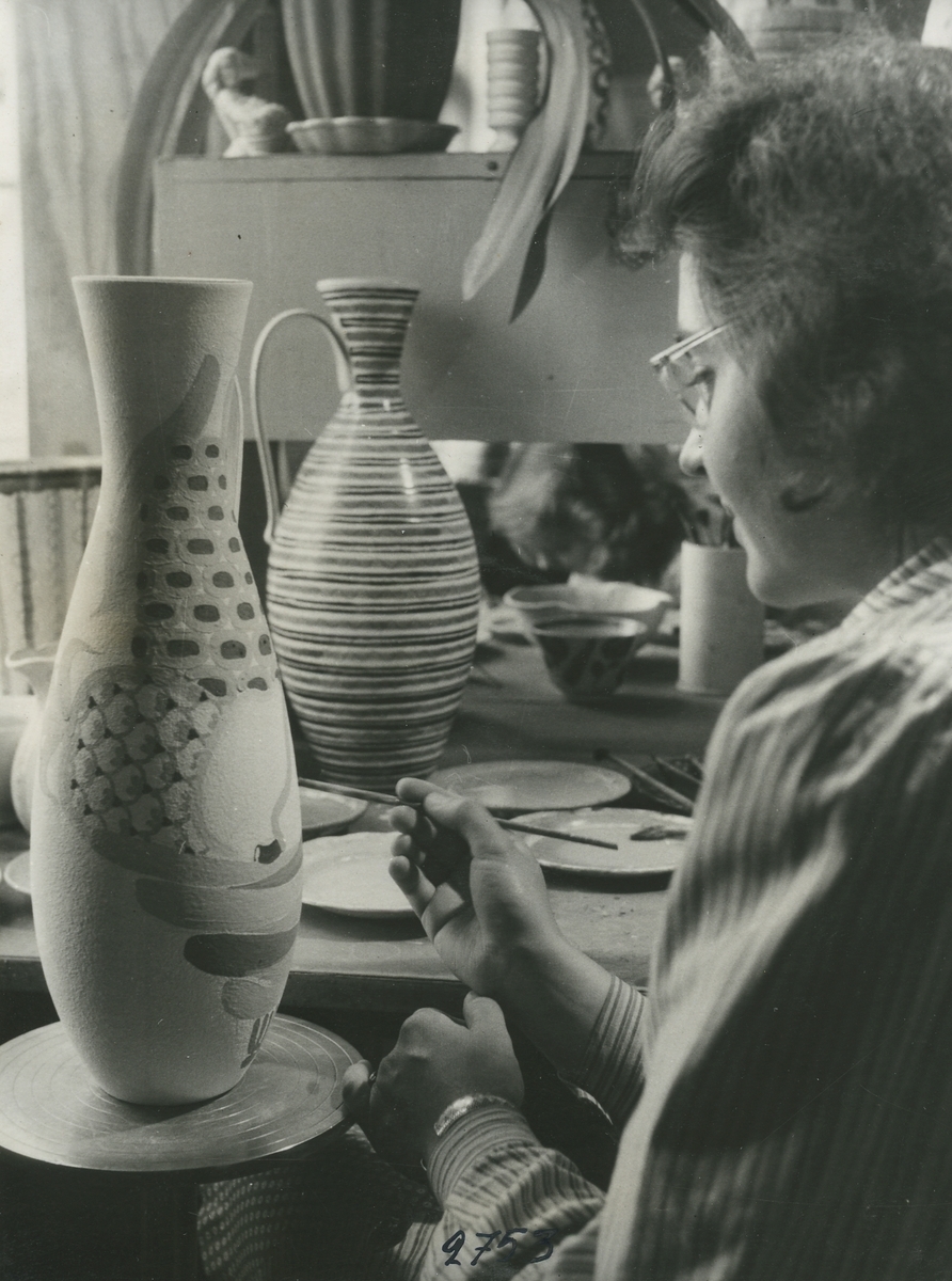 Interiörbild. Sannolikt G-Studion. Penseldekorering av unikt fajansgods efter Stig Lindbergs skisser 1957.