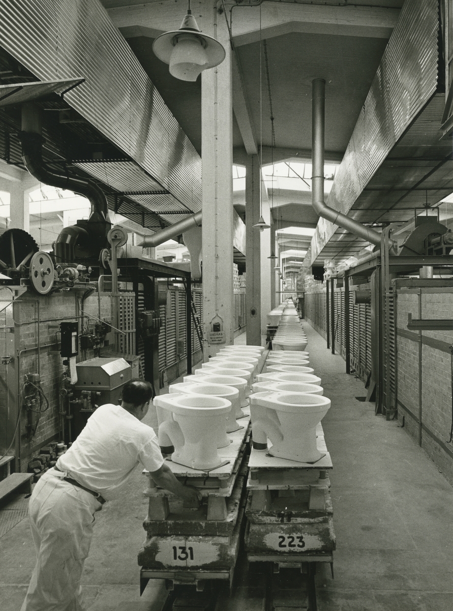 Titel: Interiörbild. Sanitetsporslinsfabriken. WC-stolar klara för bränning. Personer: Fabriksarbetare.