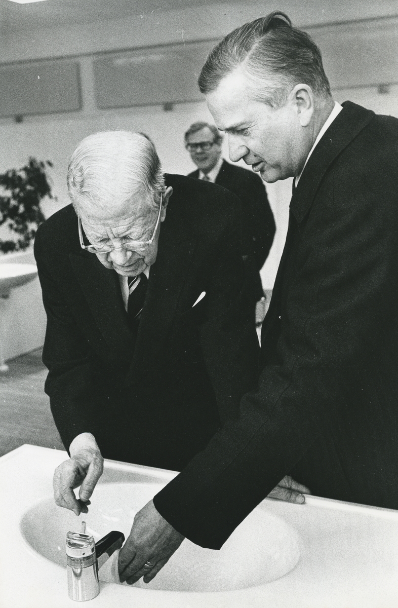 Interiörbild. Kungligt besök av Gustav VI Adolf, Förevisning av sanitetsporslin av Bertil Dahllöf.